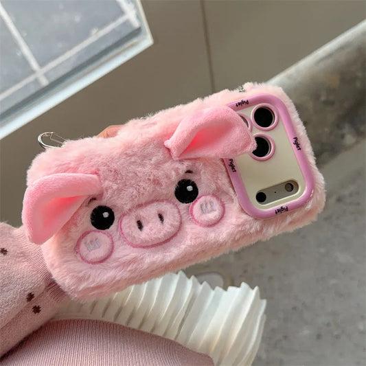 Cute 3D Cartoon Pig Plush Phone Case With Lanyard For iPhone