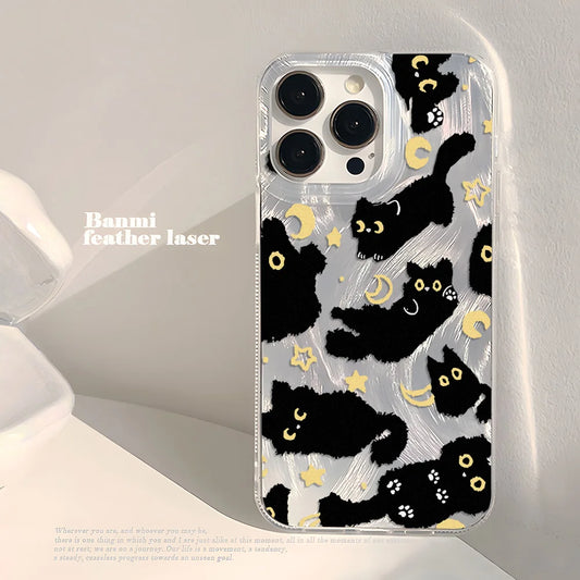 Laser Silver Black Cat iPhone Case With Feather-Texture Protection