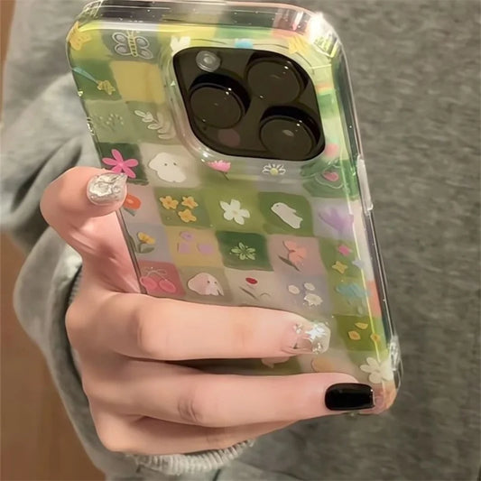 IND Green Grass Grid Pattern Broken Flower Rabbit Phone Case With Chain For iPhone