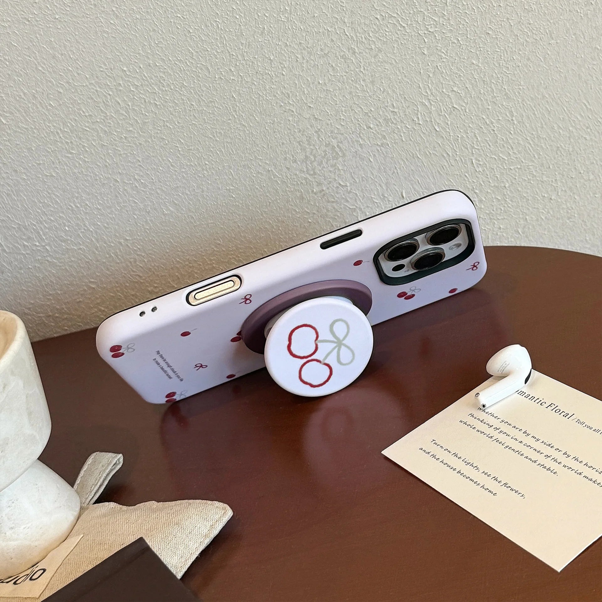 Combine style and functionality with this Korean-designed phone case featuring an adorable cherry cartoon aesthetic. The integrated magnetic stand holder allows hands-free viewing for videos, calls, and content consumption. Crafted with precision engineering, it delivers reliable protection while maintaining a slim profile. The magnetic technology ensures secure attachment to compatible surfaces and accessories. Perfect for iPhone users seeking a blend of cute design and practical everyday utility.