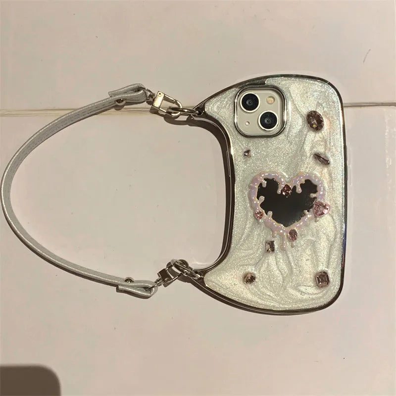 Elevate your iPhone protection with this luxury 3D glitter gemstone case, featuring an eye-catching love heart mirror design. The intricate gemstone embellishments and shimmering glitter create a sophisticated, eye-catching aesthetic that reflects light beautifully. The integrated mirror adds practical functionality for quick touch-ups on the go. Engineered with premium materials, this case delivers reliable shock absorption and scratch resistance while maintaining its stunning visual appeal. Perfect for those who refuse to compromise between style and durability.