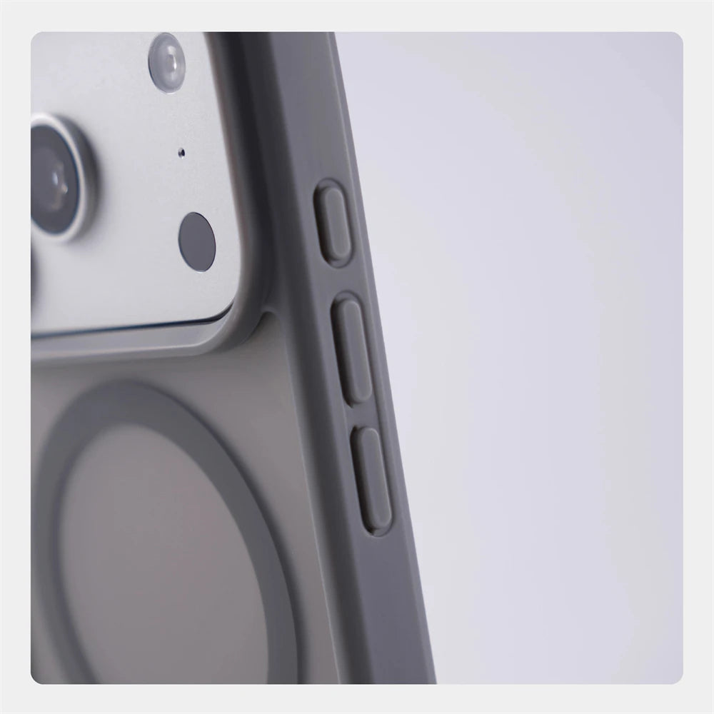 Protect your iPhone with precision engineering and refined aesthetics. This matte translucent case combines a frosted finish that resists fingerprints with seamless MagSafe compatibility for wireless charging and magnetic accessories. The reinforced metal holder bumper absorbs impact at vulnerable corners while maintaining a slim profile. Crystal-clear back panel showcases your device's original color without compromising durability. Engineered for everyday protection with a premium feel.