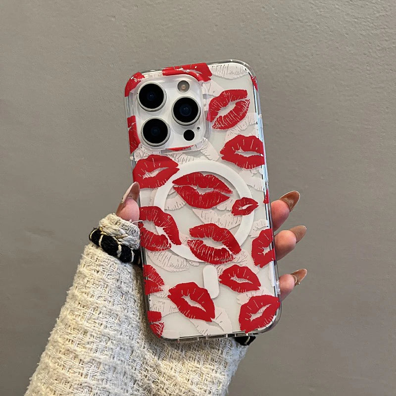 Red Lip Print MagSafe Magnetic Wireless Charging Case for iPhone Make a bold statement with this striking red lip print design. Engineered with integrated MagSafe technology, this case delivers seamless compatibility with magnetic wireless chargers and Apple's ecosystem of accessories. The precision-molded construction protects your iPhone while maintaining full access to ports and buttons. Durable materials resist daily wear, keeping your device secure without compromising style. Perfect for those who refuse to compromise between protection and personality.